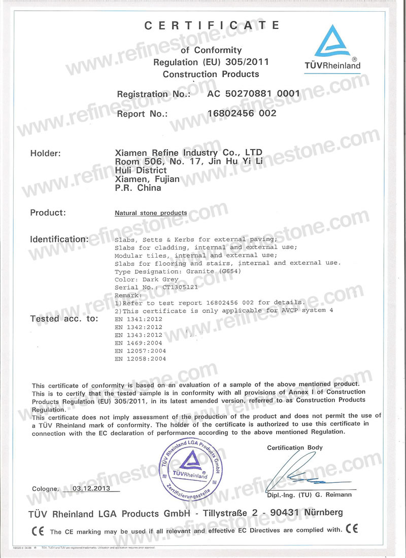 RefineStone Industrial Co.,LIMITED provides quality products to all over the world. In order to give the customers more confidence in our company, we have been doing more and more tests of CE certificate by TUV or SGS for many stone colors. Here are some examples for your reference.